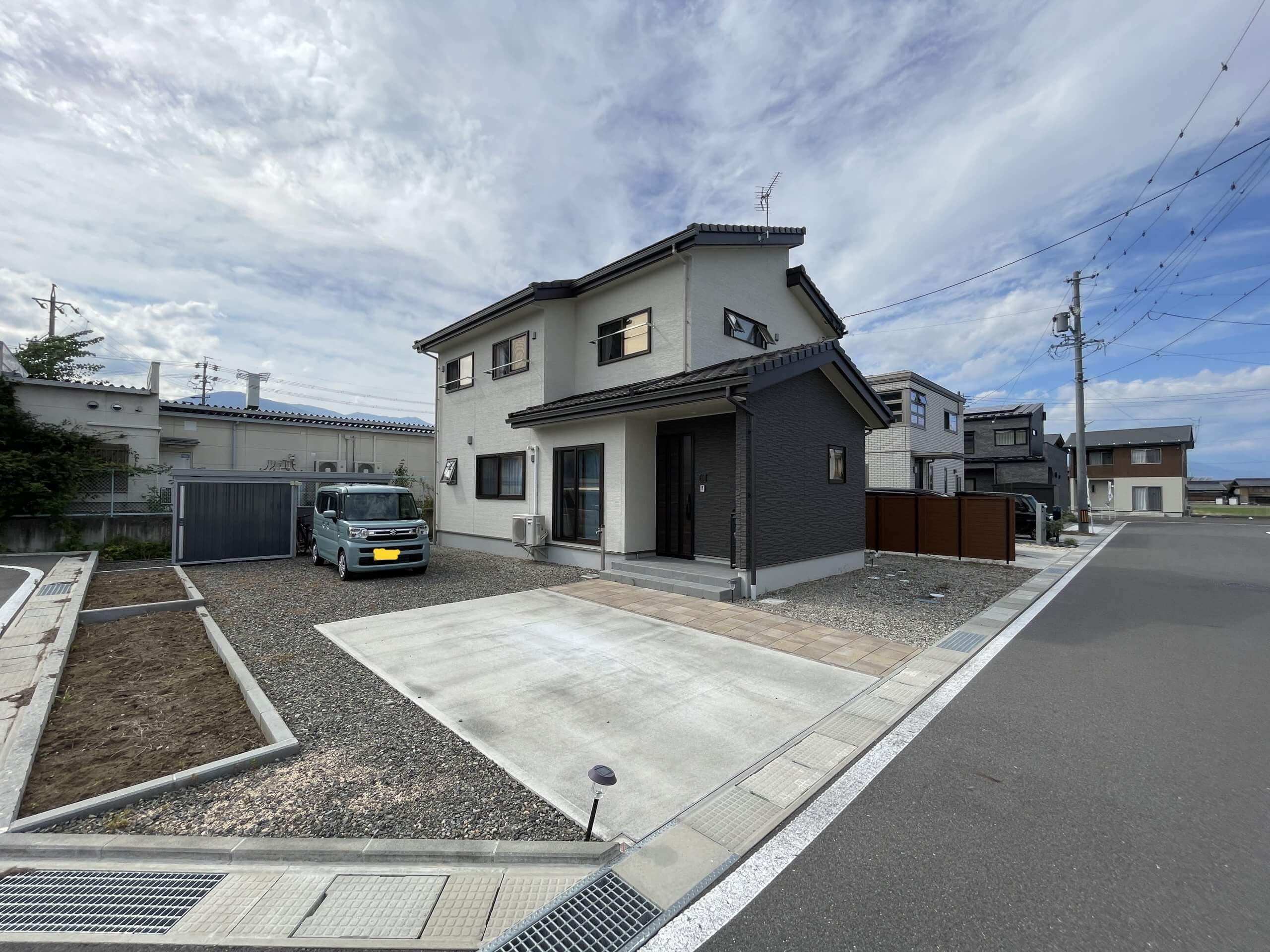 ↑外構は駐車場2台分のコンクリート舗装、玄関までのアプローチ、物置とサイクルポート、花壇ありです!庭スペースも広いため、駐車場5台ほど停められそうです。