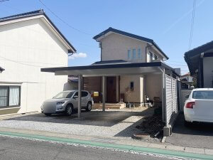 玄関側に車3台駐車可能なスペースとカーポート付きです!二方向接道で玄関側は道幅ゆったりの道路に接道しております。